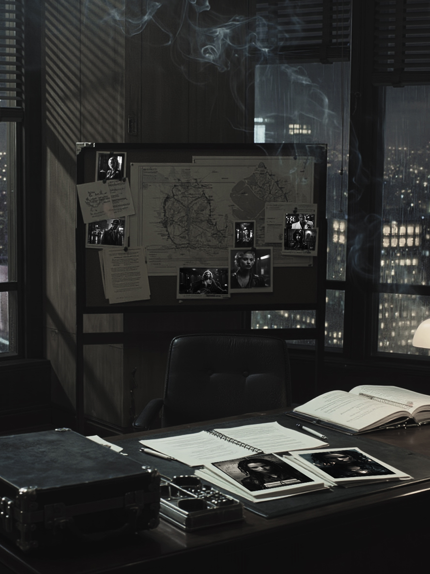 The office is quiet, save for the distant hum of the city below and the rhythmic tapping of rain against the windows. Light filters through venetian blinds, casting long shadows that shift as the night wears on. It is not a place of comfort—but it is a place of control.