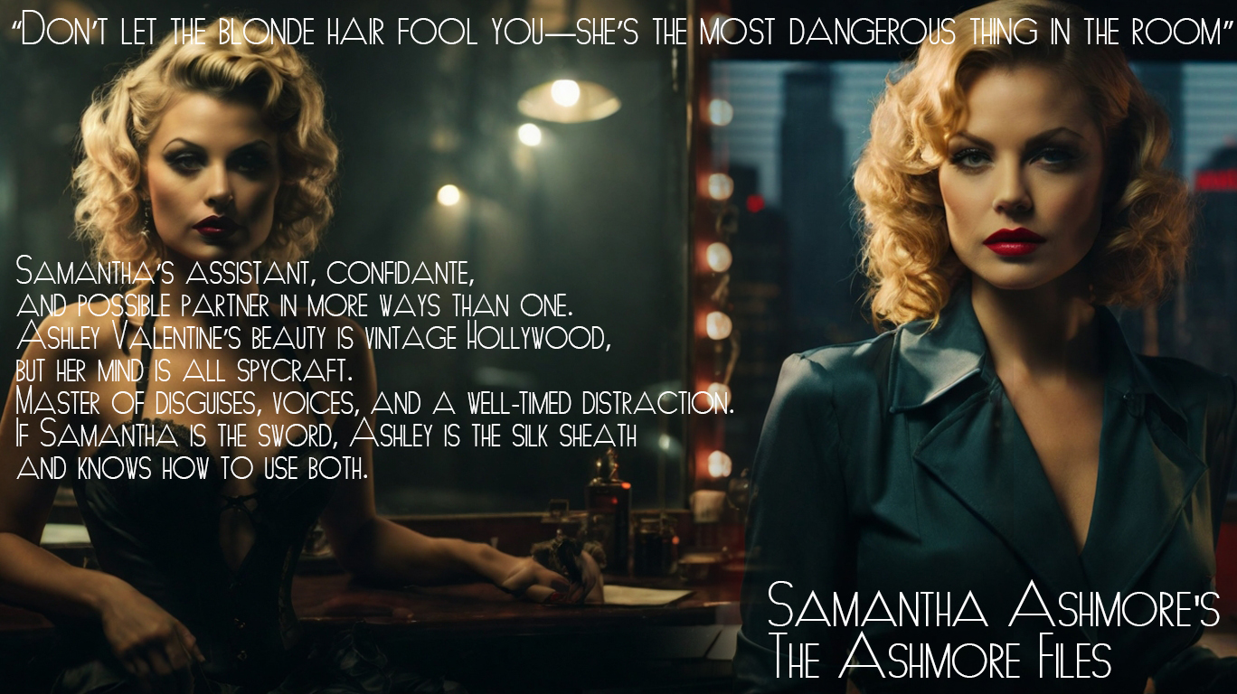 Samantha’s assistant, confidante, and possible partner in more ways than one. Ashley’s beauty is vintage Hollywood, but her mind is all spycraft. Master of disguises, voices, and a well-timed distraction. If Samantha is the sword, Ashley is the silk sheath—and knows how to use both.