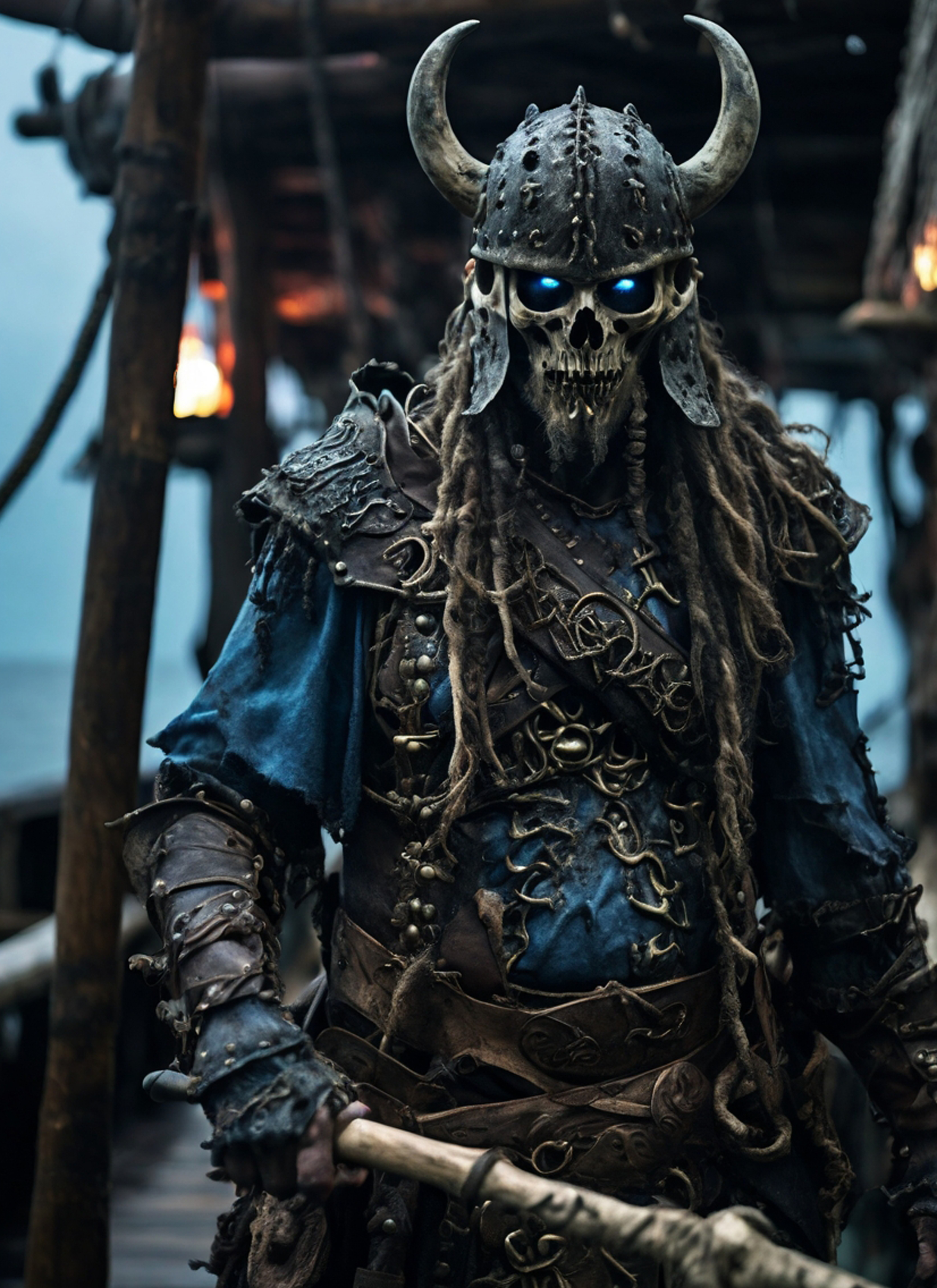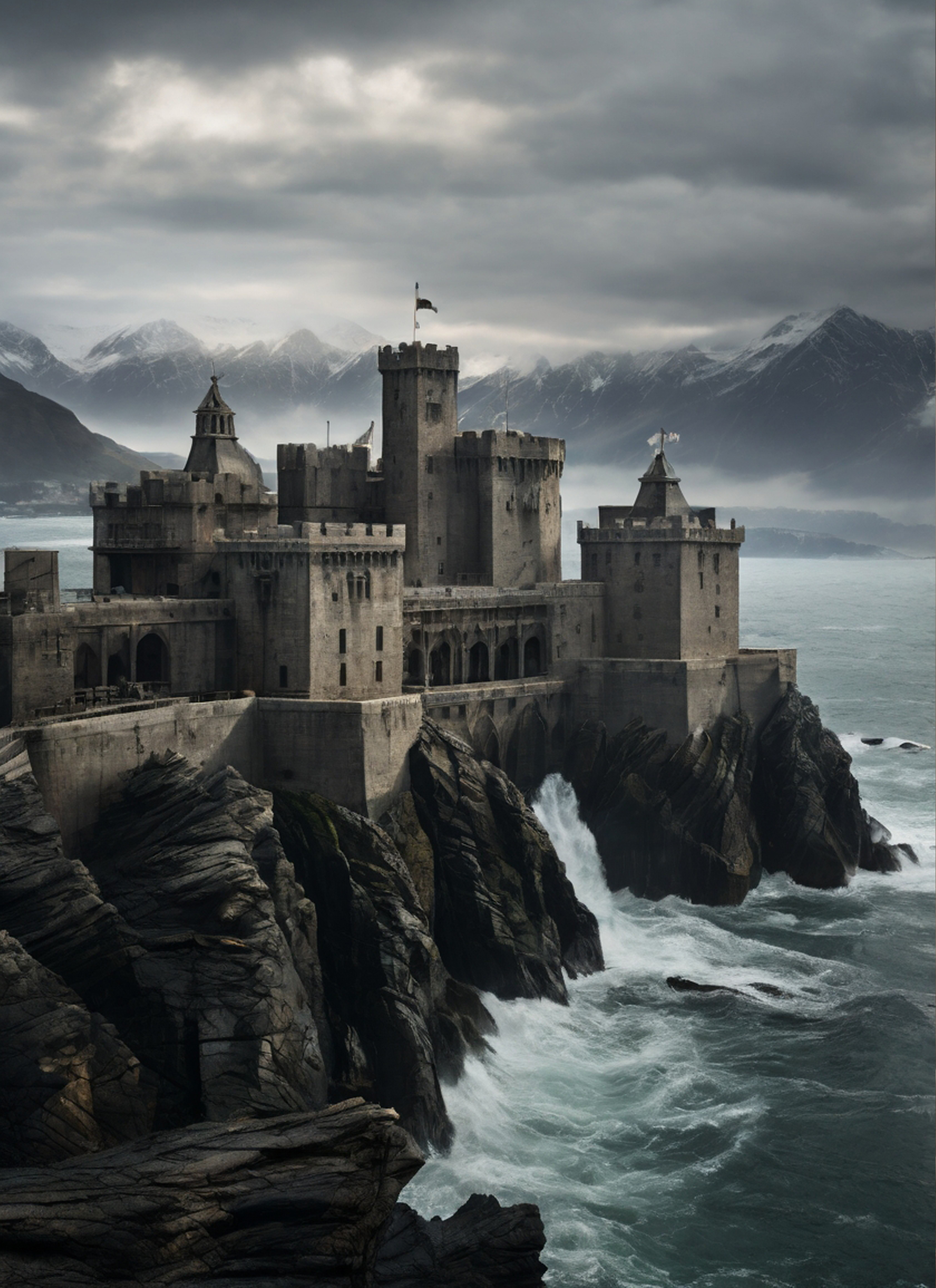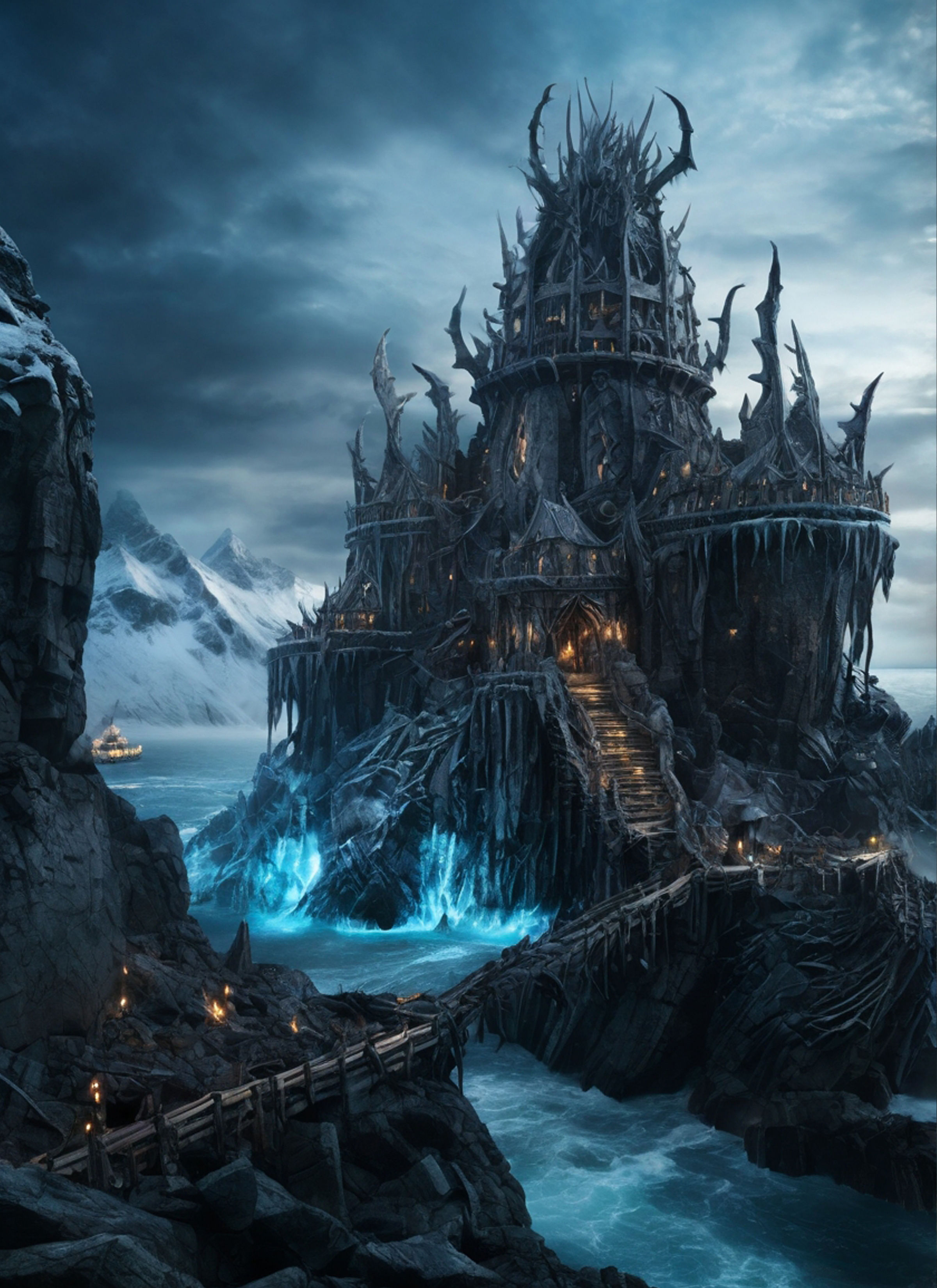 Description: A fortified, frozen cliffside stronghold carved into the bones of a sea leviathan, where Viking-pirate hybrids launch raids across the oceans.