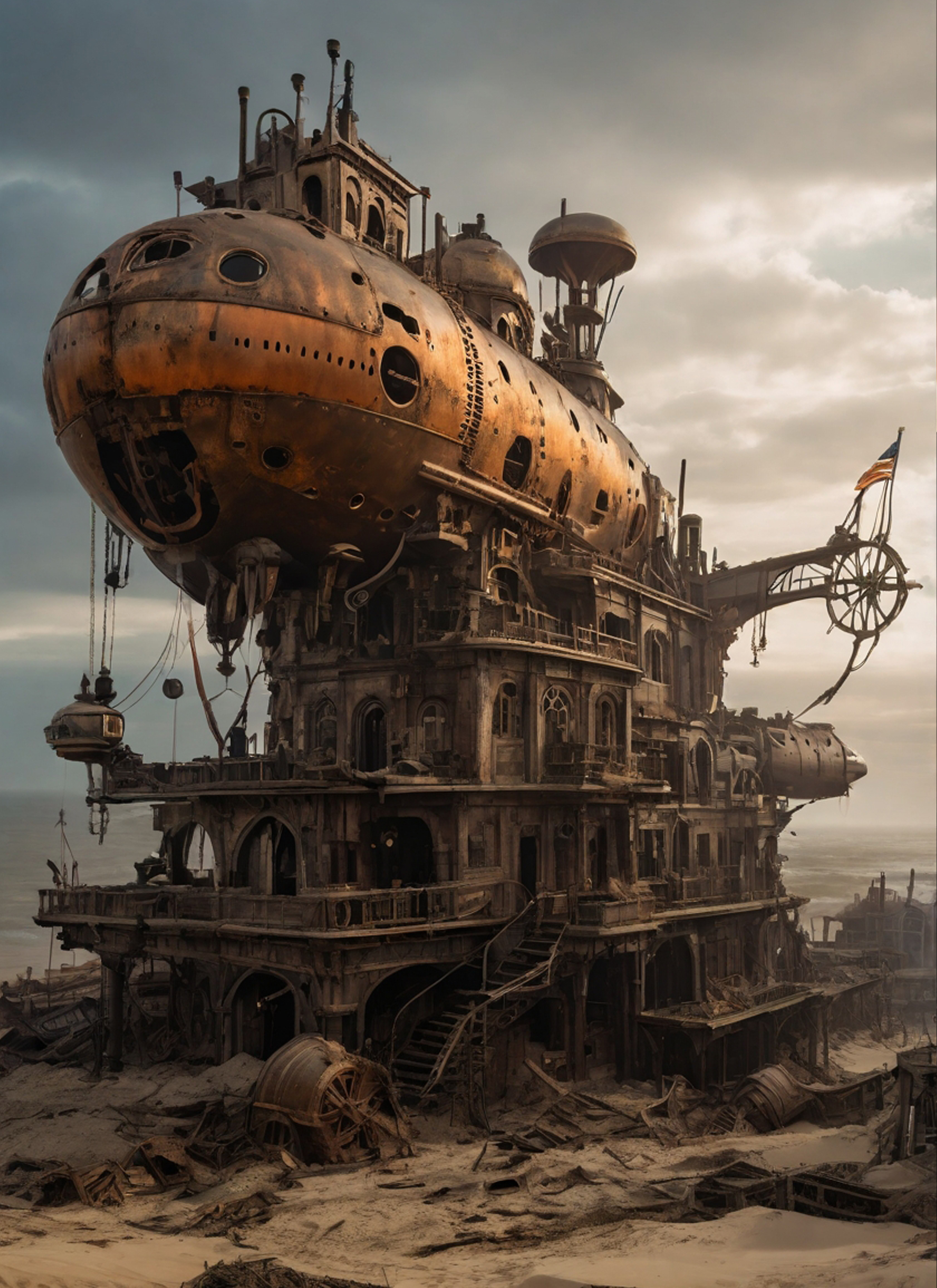Description: A shattered wasteland city split by a magical cataclysm in the previous era. Half-sunken in sand and rubble, its survivors rebuild with scavenged machines, wild tech, and outlaw spirit.